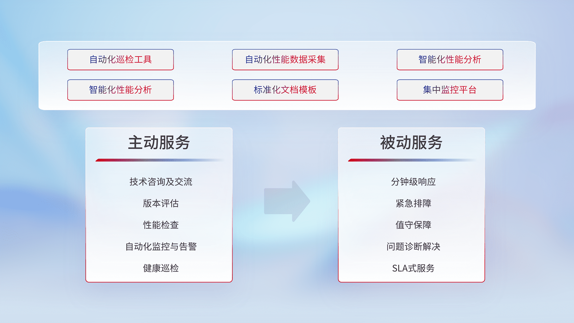 智能化工具和标准化文档,,,,保障服务质量,,,,提供主动服务(包含技术咨询、、、、版本评估、、、、性能检查、、自动化监控与告警、、、、健康巡检)和被动服务包含(分钟级响应、、紧急排障、、、值守保障、、、、问题诊断解决、、SLA服务)。。